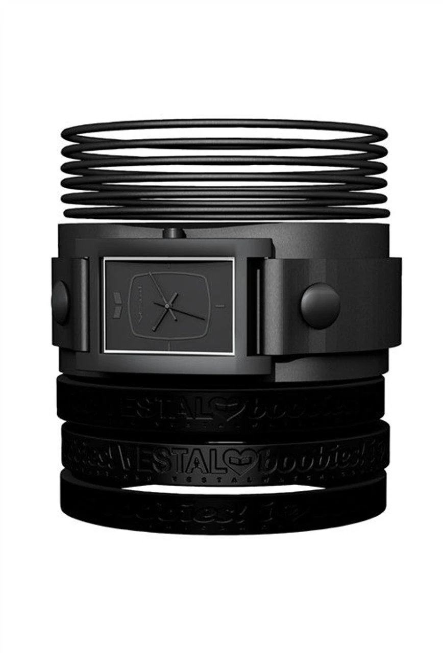The watch for the girl who’s gaga for gadgets (and Lady Gaga might even wear it too), the Vestal Electra Jelly features a wild amalgamation of injected molded bangles, a minimalist black timepiece, and a spring-like set of rubber bracelets that, when assembled, give your wrist the look of a cyborg-ette. Keeping with the black molded bracelets, the watchband itself is made of durable, injection molded translucent plastic. What’s more, the lightweight feel of this watch will have you thinking it really is a part of you, your new-and-improved time-telling wrist.